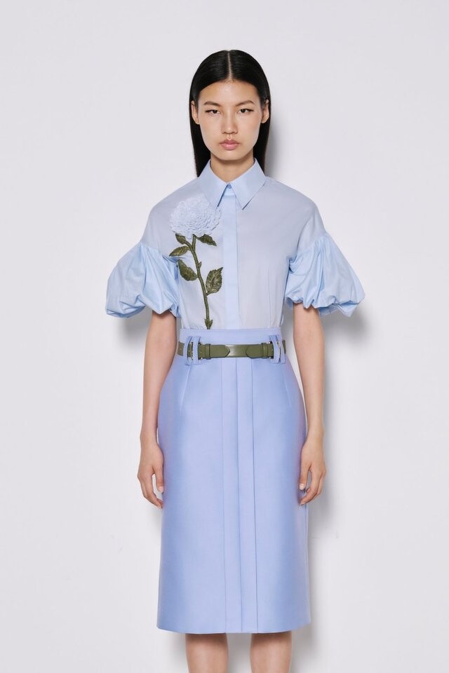 Dice Kayek这款带有浅蓝色调的澎澎袖衬衫,以立体绿叶刺绣点缀细节,柔中带刚,展现出恰到好处的浪漫与干练。澎澎袖的设计增添一抹轻盈感,无论是搭配长裙还是俐落西装裤,都能轻鬆诠释妈妈独有的优雅气场与品味风格。
