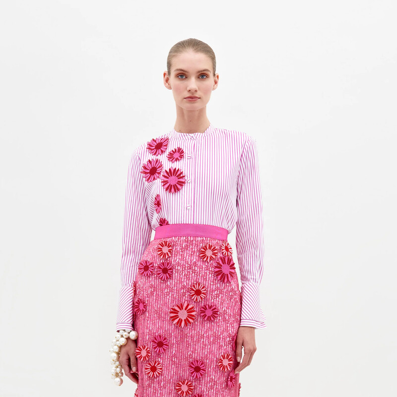 粉红条纹的Silvia Tcherassi无领衬衫搭配立体花卉长裙,构筑出一套鲜明又富有层次感的穿搭组合。简约的上身设计呼应下身的繁複细节,在对比中展现平衡美感。合身剪裁巧妙修饰身形曲线,不仅优雅迷人,更让整体造型散发出温柔中带有力量的女性风格。