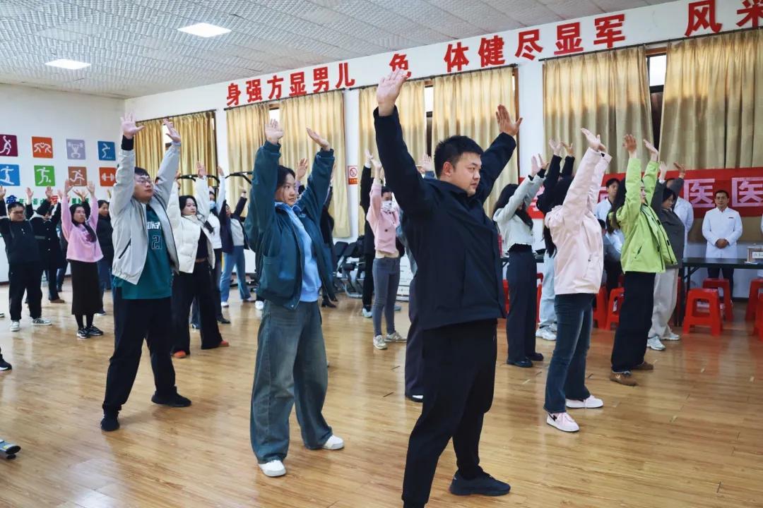 随后,罗莉医师现场带领大家学习传统养生功法“八段锦”。伴随着舒缓的音乐,罗莉医师一招一式地分解动作,细致讲解要领。与会人员纷纷起身模仿学习,在动静结合、松紧有度的练习中,亲身感受中华传统导引术的独特魅力,体验疏通经络、调养气血的效果,现场学习氛围浓厚。